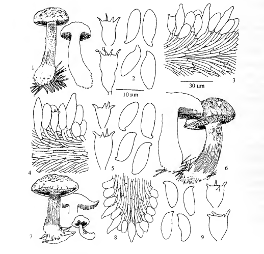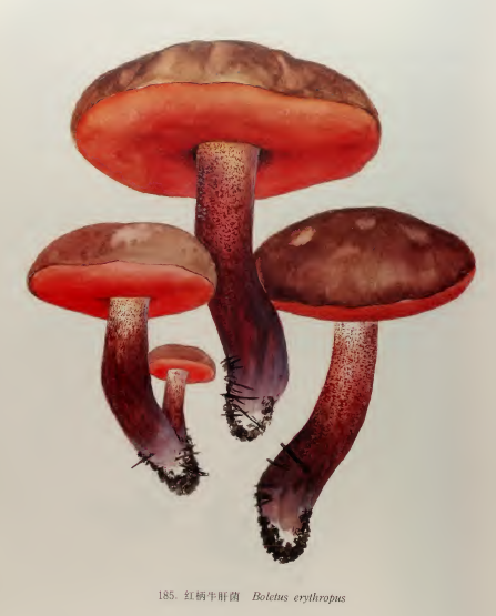 菌盖宽6—12cm,半圆形,后近平展。表面干燥,不黏。改表初具短毛绒,后近平滑,褐玫瑰红色,褐红色,褐紫红色,盖缘微具红黄色,盖表伤后呈褐黑色,锈铁褐色。菌盖肉厚1一2cm,肉质坚脆,黄色,伤后迅速变蓝。菌肉生尝微甜,闻之有菌香气。菌孔单孔型,菌管长1一1.2cm,菌孔呈橘红色,深红色,褐红色,菌孔不规则圆形,多角形,菌口径0.5—0.8_,即20~28孔/cm,伤后变蓝色。近柄处下陷。菌管髓菌丝呈双叉分排列。菌柄粗棒状,近等粗或基部膨大,6—10x1—2(3)cm,上部柠檬黄色,中下部呈橘红色,深红色,基部锈红色,无网纹或上部具不明显的网纹,多被有深红色的颗粒状突起或麸糠状物,柄基菌丝黄色。担孢子长椭圆形,长杏仁形,长纺锤形,13—16x4.5—6pm,两侧不甚对称,黄褐色,赭褐色。孢顶圆形至狭圆形,孢尖突侧向倾斜,渐尖,胳上压微下陷。担子长棒状,15—20x8—llum,侧缘囊状体较少,腹鼓状,尖渐钝,34—45x8—13pm,孔缘囊状体几与上同形。种名释义:erythro拉丁语:红色的,opus足、柄,言此菌菌柄红色。模式产地:原记录是欧洲,原模式存处不详。